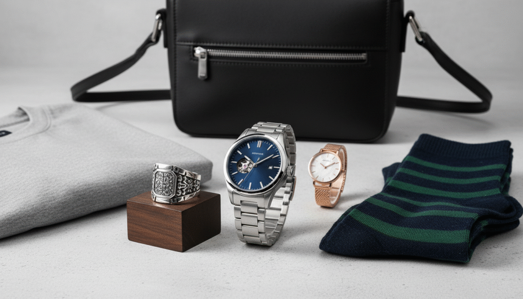 Expect durable materials, precise movements, and design versatility: watches with quartz or mechanical movement, stainless steel or leather bands, and water resistance for daily wear; jewelry in gold or silver with durable settings; branded apparel and accessories that complete outfits from work to weekend.