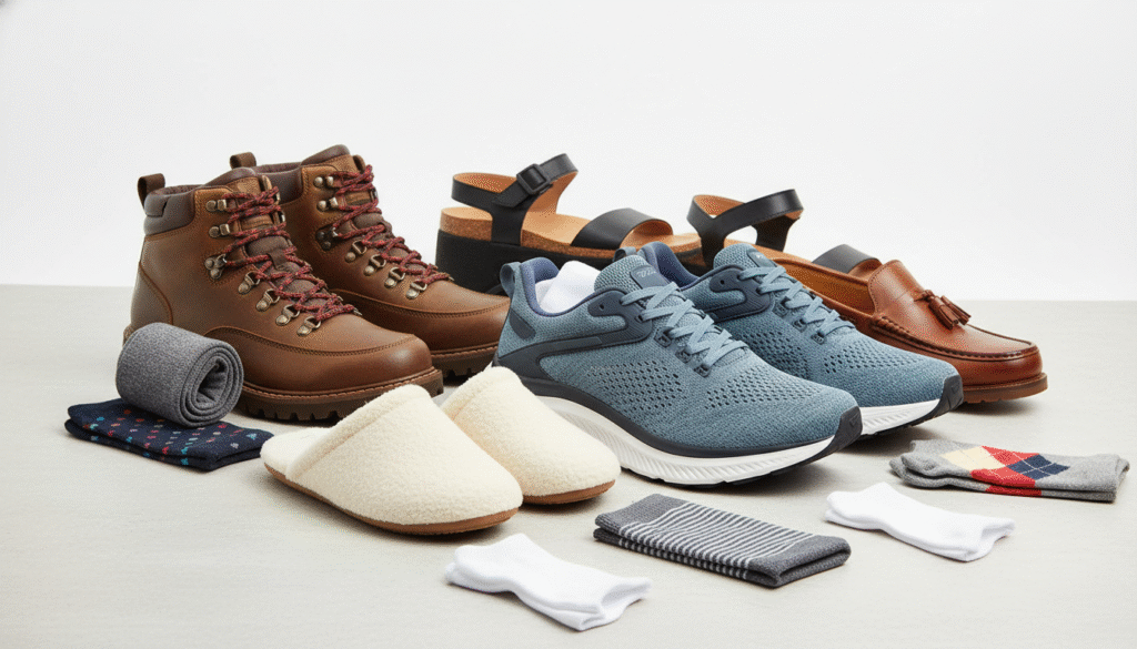 Buying considerations include fit and width, intended use (casual, work, sport), climate and weather resistance, insulation, and care needs. Variations span athletic sneakers, casual dress shoes, rugged outdoor boots, and lightweight sandals, plus indoor slippers for home comfort. Complementary items such as Sock Snob socks can enhance comfort and hygiene across all footwear occasions.